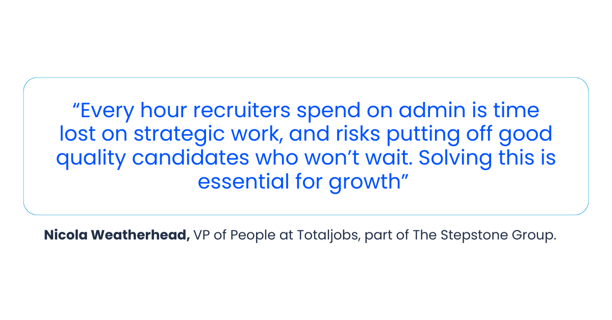 Across just four vacancies a month, that’s nearly 850 hours of admin per recruiter per year. Which is time lost on strategic work, candidate relationships, and actual placements.